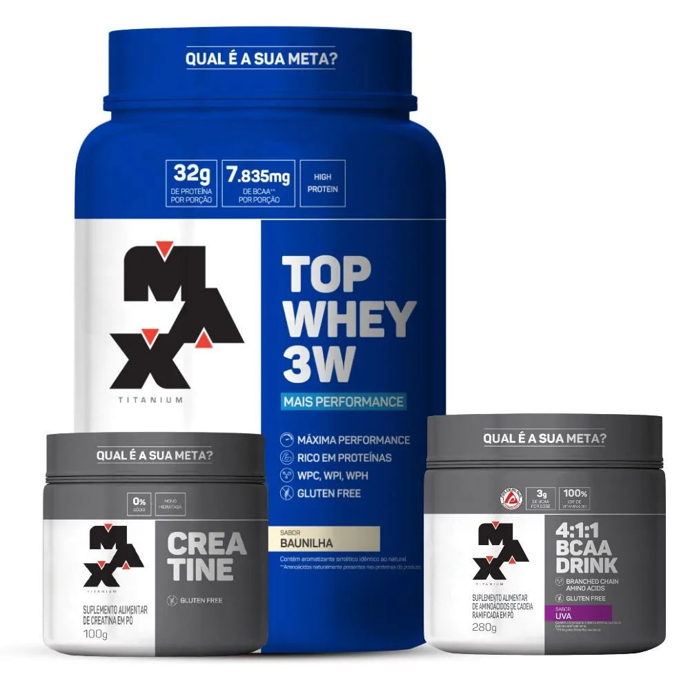 1 unidade de Top Whey + Performance (sabor a escolha) + 1 unidade de Bcaa Drink (sabor a escolha) + 1 unidade de Creatina 100g