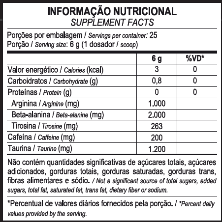 Sua formulação é concentrada e é fonte dos aminoácidos beta-alanina, taurina, cafeína, arginina e tirosina, que atuam em sinergia para auxiliar ainda mais seu desempenho.