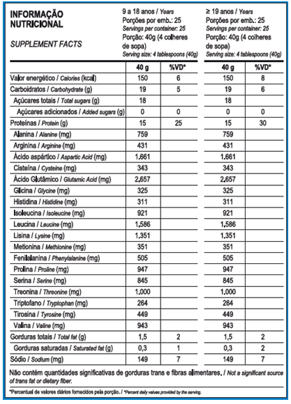 Misture 40g (4 colheres de sopa*) em 200mL (1 copo) da bebida de sua preferência (água mineral, leite desnatado, etc).